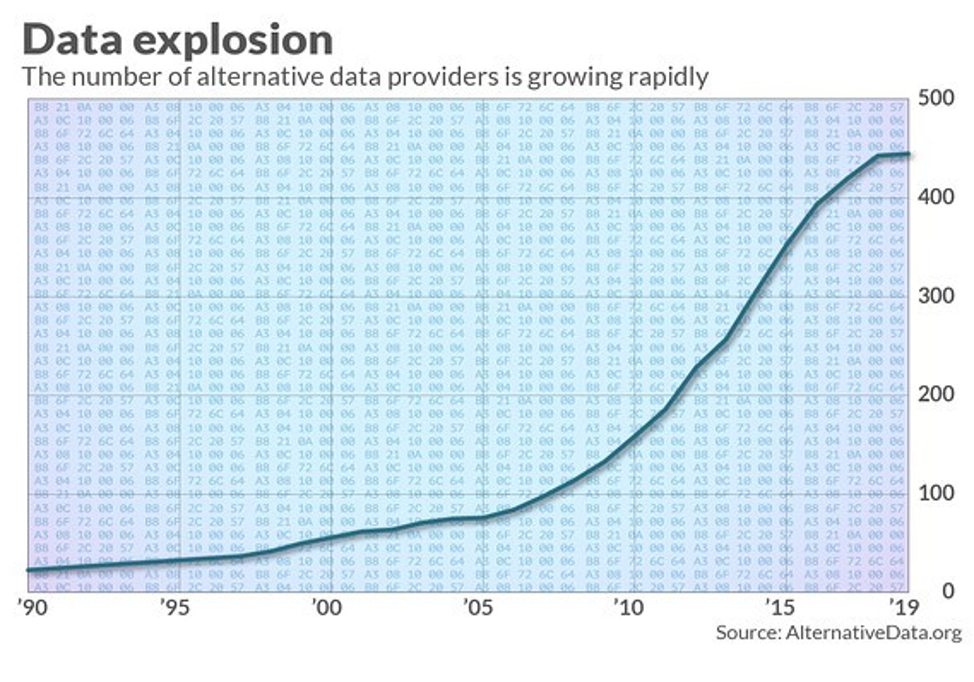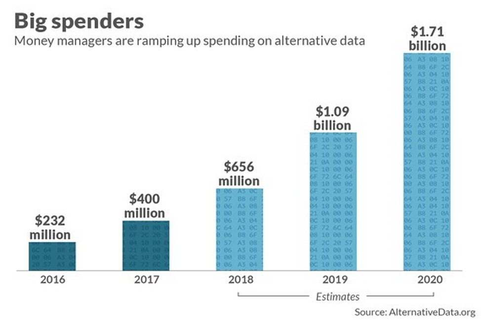 Общие расходы на альтернативные данные со стороны организаций-покупателей: паевые инвестиционные фонды, хедж-фонды, пенсионные фонды, частные акционерные организации и т. д., которые покупают инвестиции или другие активы - подскочили с 232 000 000 долларов США в 2016 год на новый прогнозируемый $ 1,1 млрд долларов в 2019 году и $ 1,7 млрд в этом году, на основе AlternativeData.org, рыночная торговая группа, поддерживаемая простым поставщиком данных YipitData. Обычно, по подсчетам группы, в настоящее время существует 447 поставщиков альтернативных данных.